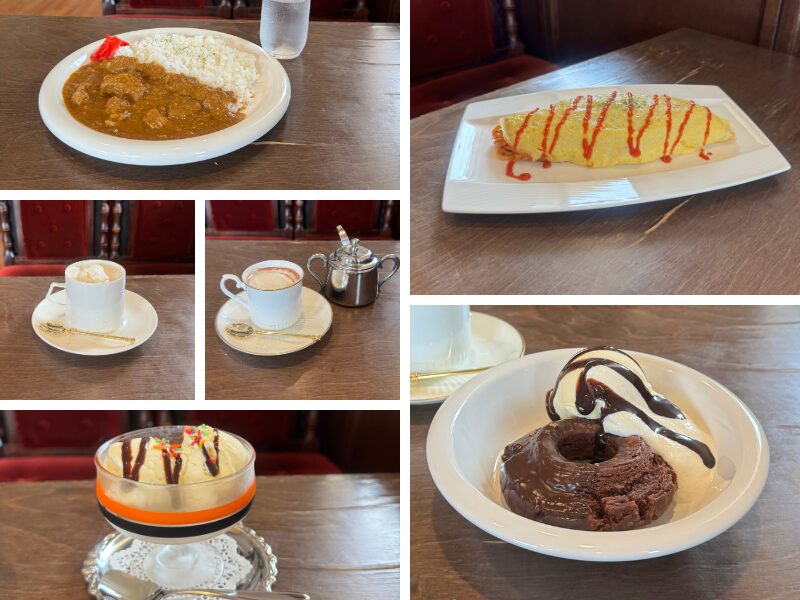 喫茶店らしいランチメニューも人気で、オム巻ナポリタンや金曜限定のスパイスカレーなどが楽しめます。