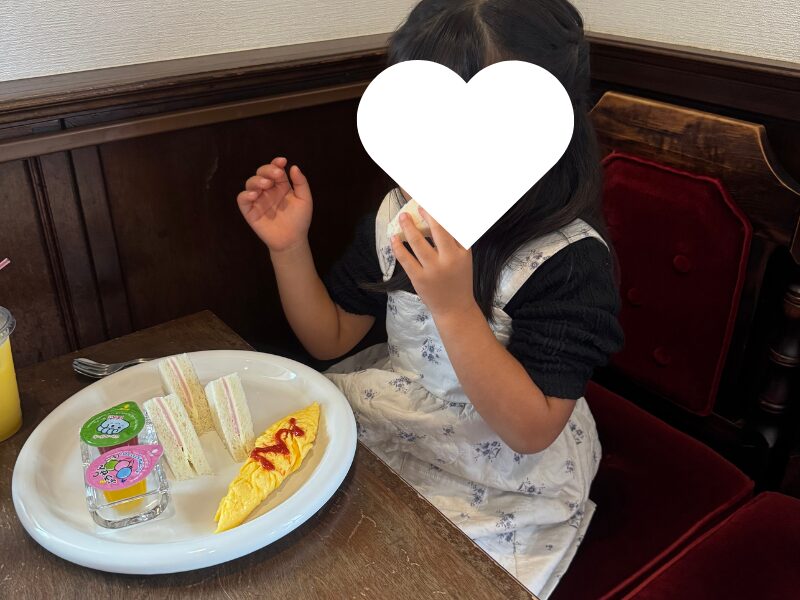 キッズプレートは、サンドイッチ・オムレツ・ウインナー・ゼリーがセットになった子ども向けメニュー。